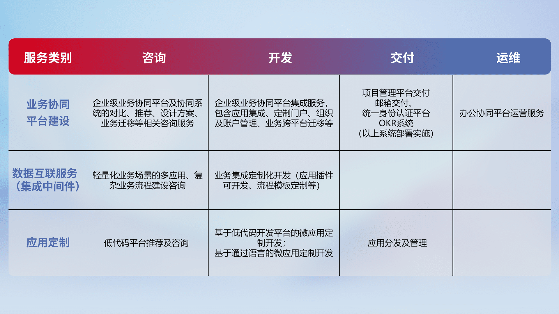 针对钉钉、、企微、、IDaas等平台级产品提供产品的规划、、、方案、、、、交付、、定制化开发等服务,,,,实现如统一协同办公、、智能客户服务、、、、混合会议管理、、智能数据查询、、、等业务场景,,实现数字化转型。。。。