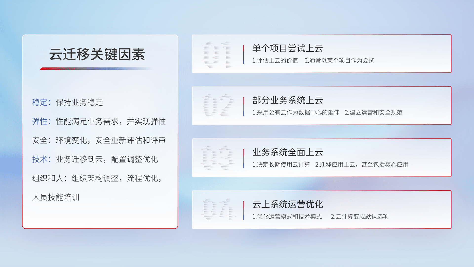 结合实际业务,,从规划设计、、云平台选型、、、、云原生改造、、、、数据迁移、、集成交付,,,迁移全过程为客户识别最佳上云路径,,,,做好风险识别管理,,,设计网络架构、、、、身份权限、、、安全审计合规、、操作审计、、、、日志审计、、、监控告警策略、、多站点容灾设计等,,,,对云上基础设施进行整体规划,,,提升IT治理水平,,以满足弹性、、、、高可用、、、高性能的需求。。。